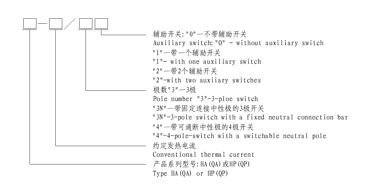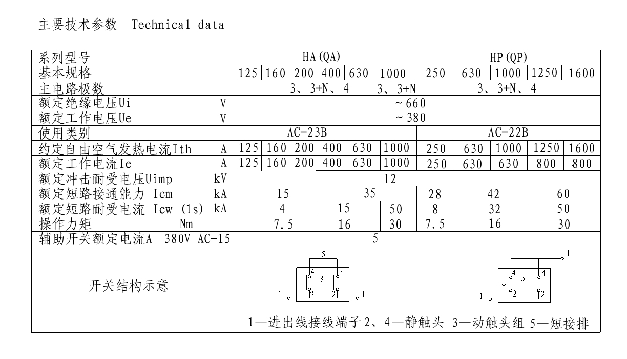 Series HA(QA)、 HP(QP) switch-disconnector are mainly applied in the distribution circuits and motor circuits with high short-circuit currents as the power switches. As the switch handle is in rotary operation, they are especially suitable for installation and application in drawer type switch cabinets. Technical performances confirm to standards IEC60947.3 and GB14048.3.This series switches are of closed structure design. The contact system is composed of static knife contacts, moving rolling contacts and arc quenching sets that are all fitted in the sealed case made of arc resistant engineering plastic and zero arc flash out is achieved. The switching mach-anism is of reliable spring energy stored independent manual operation style.On the upper part of the. switch utmost two auxiliary switches may be quipped in, each having a set of electrical separated normal open and normal closed contacts.