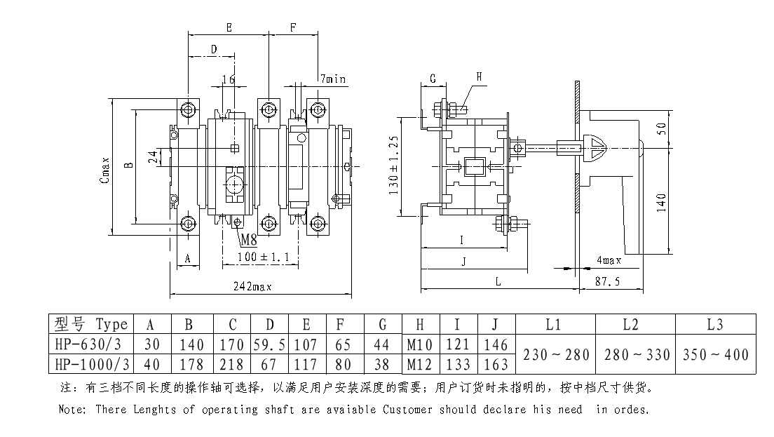 本系列隔离开关由刀型静触头、滚动动触头及灭弧装置组成的接触系统 均组装在由耐弧工程塑料制成的封闭底座内,能达到零飞弧。操作机构由具有 弹簧储能的连杆传动机构构成,靠弹簧力完成开关的分、合,使开关动作无关 人力操作。手柄由操作手柄和传动轴等构成,属旋转操作方式。当手柄旋转操 作时,使操作机构弹簧储能,靠储能的弹簧力释放带动动触头与静触头形成 合、分两种状态,从而达到开关分、合主电路的目的。